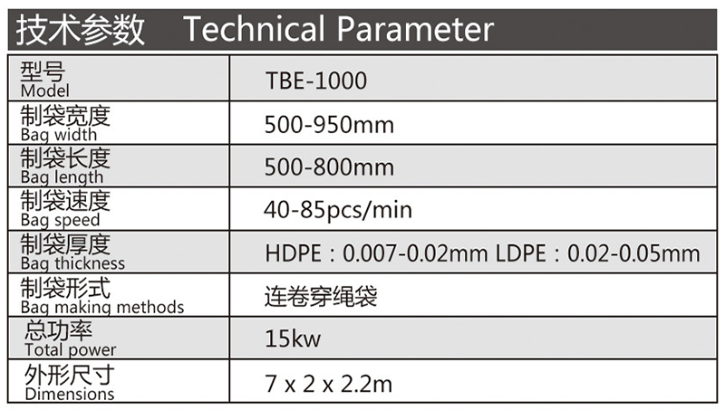 機器特性 此設備為生產(chǎn)連卷穿繩袋的專用設備,制袋速度快,調(diào)節(jié)簡單。此設備采用全鋼板一體而成,用電220v照明電即可。