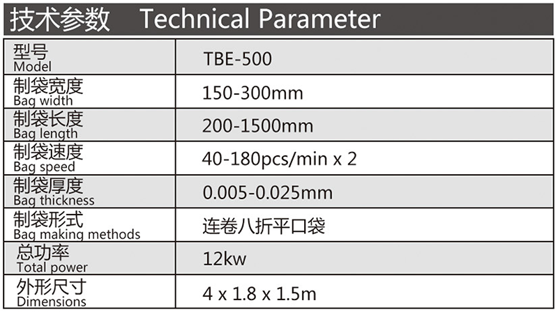 機(jī)器特性 此設(shè)備為生產(chǎn)連卷八折平口垃圾袋的專用設(shè)備,雙通道高速無(wú)拉伸底封好,收卷整齊,個(gè)數(shù)準(zhǔn)確,手動(dòng)手卷。主動(dòng)放料,薄膜張力穩(wěn)定此設(shè)備采用全鋼板一體而成,用電220v照明電即可。