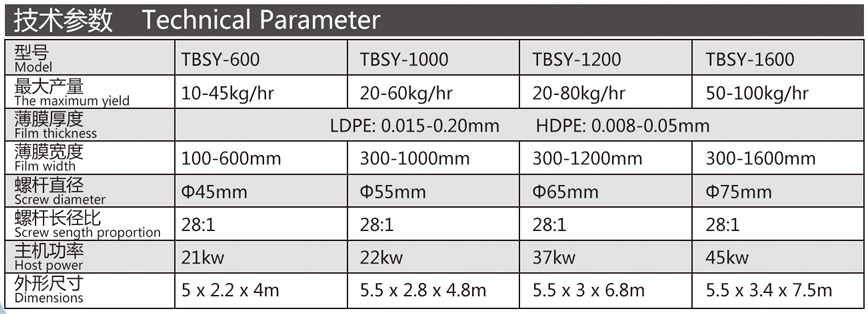 吹制各種規格的低密度聚乙烯、高密度聚乙烯和線性低密度聚乙烯塑料薄膜,廣泛應用于食品百貨、日用、化工、針紡品、購物禮袋和工業包裝。機筒、螺桿采用38CrMOAI合金材料經氨化處理精密加工而成具有很好的耐磨和耐腐蝕性。
